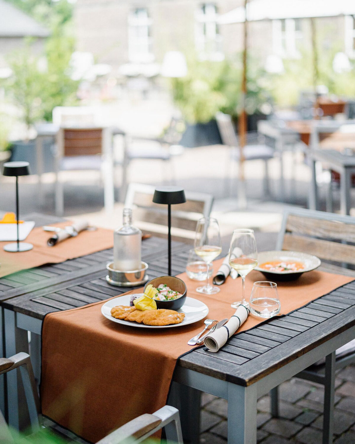 Ob zum Daydrinking am Sonntagnachmittag, dazu etwas Herzhaftes oder ein schlossgemachter Blechkuchen nach Tagesangebot oder ein entspanntes Abendessen mit Blick auf das Haupthaus des Schlosses – jeder Gast ist willkommen und soll sich wohlfühlen.